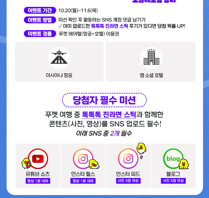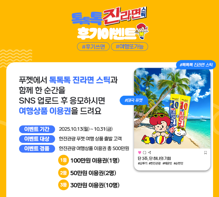 - 본 이벤트의 당첨자는 한진관광·(주)오뚜기·엣지랭크에서 선정하며, 당첨자에게는 별도로 연락 드립니다.